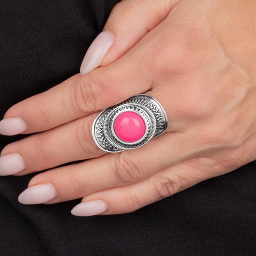 A neon pink bead is pressed into the center of a stacked silver frame radiating with sunburst patterns, creating a flamboyant centerpiece. Features a stretchy band for a flexible fit.