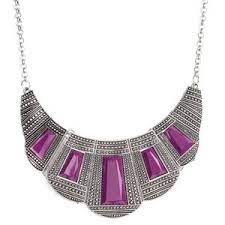 Featuring faceted Emerald style cuts, bold geometric plum beads are pressed into studded silver frames that dramatically link below the collar for a fierce finish. Adjustable clasp closure. Matching earrings included.