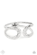 Etched in a rustic linear motif, oversized silver ribbons loop into an airy cuff around the wrist. Rows of sparkly white rhinestones embellish the center, adding a spritz of glitz to the gritty design. Features a hinged closure.