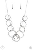 Oversized asymmetrical silver rings swing from the bottom of a glistening silver chain. Matching silver rings, encrusted in hematite rhinestones, trickle between the dizzying fringe adding sparkly smolder to the edgy display. Features an adjustable clasp closure.