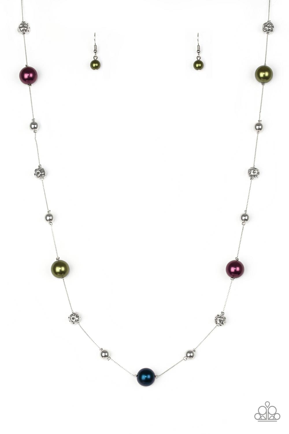 Infused with pearly multicolored accents, classic silver and delicately hammered silver beads trickle along an elegantly elongated silver chain for a refined look. Features an adjustable clasp closure.