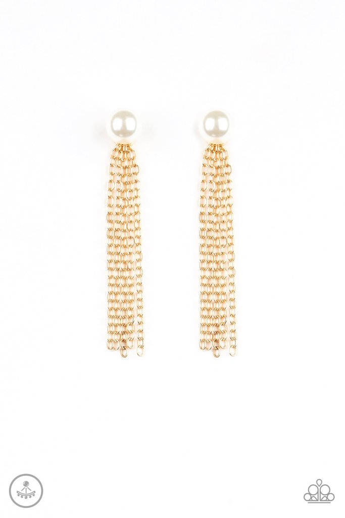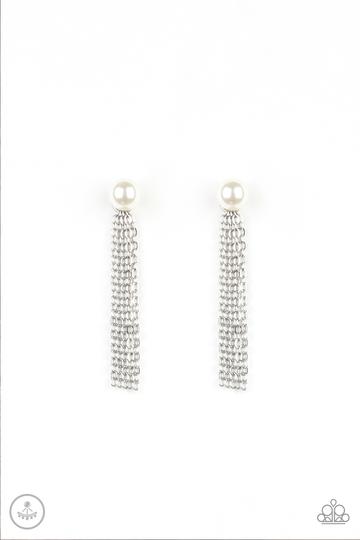 A solitaire white pearl attaches to a double-sided post, designed to fasten behind the ear. Brushed in a high-sheen shimmer, glistening chains peek out beneath the ear for a bold tasseled look. Earring attaches to a standard post fitting.