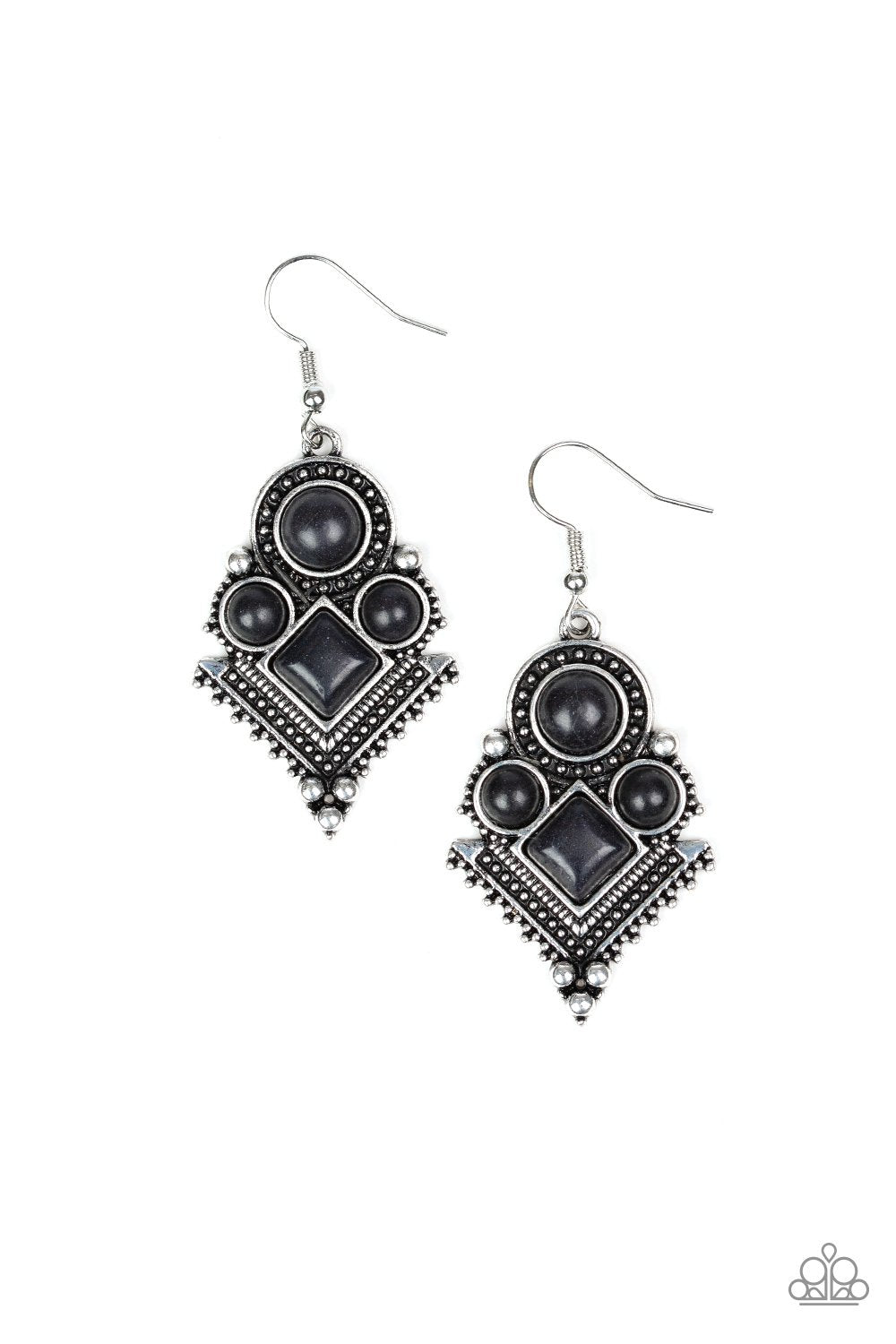 Chiseled into round and square beads, natural stones are pressed into an ornate geometric frame radiating with shimmery silver studs for a tribal inspired look.