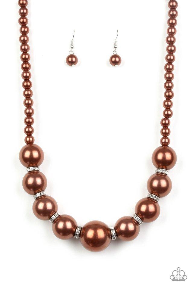 Threaded along an invisible wire, classic brown pearls give way to an alternating collection of oversized brown pearls and white rhinestone encrusted rings below the collar for a timeless sparkle. Features an adjustable clasp closure.