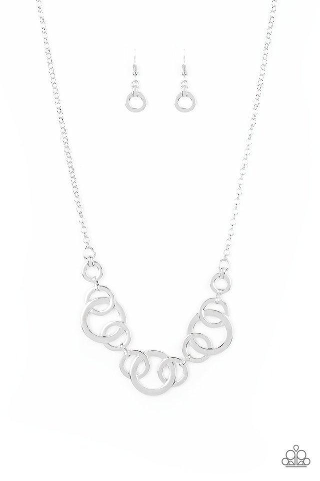 Varying in size, frames of flat shiny hoops link below the collar for a dizzying look. Features an adjustable clasp closure. Sold as one individual necklace. Includes one pair of matching earrings.