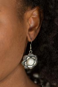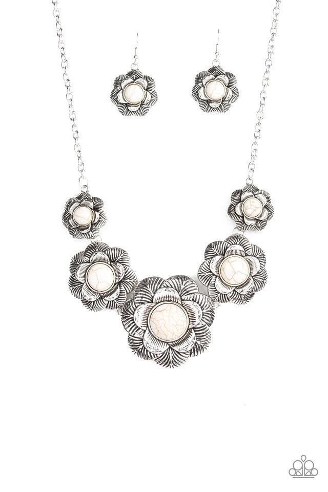 Featuring natural stone centers, textured floral frames gradually increase in size as they delicately link below the collar for a stylishly seasonal look.
