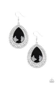 A dazzling black teardrop rhinestone is pressed into the center of a stack of teardrop frames radiating with glassy white rhinestones, creating a glamorous lure. Earring attaches to a standard fishhook fitting. Sold as one pair of earrings.