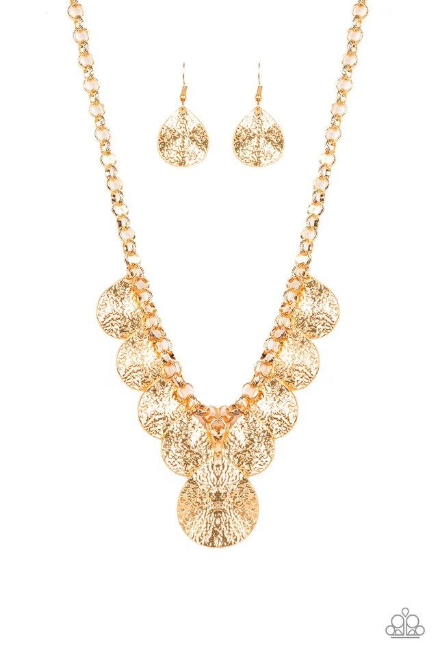 Hammered in blinding shimmer, glistening gold teardrops dangle from a textured gold chain, creating an edgy fringe below the collar. Features an adjustable clasp closure.
