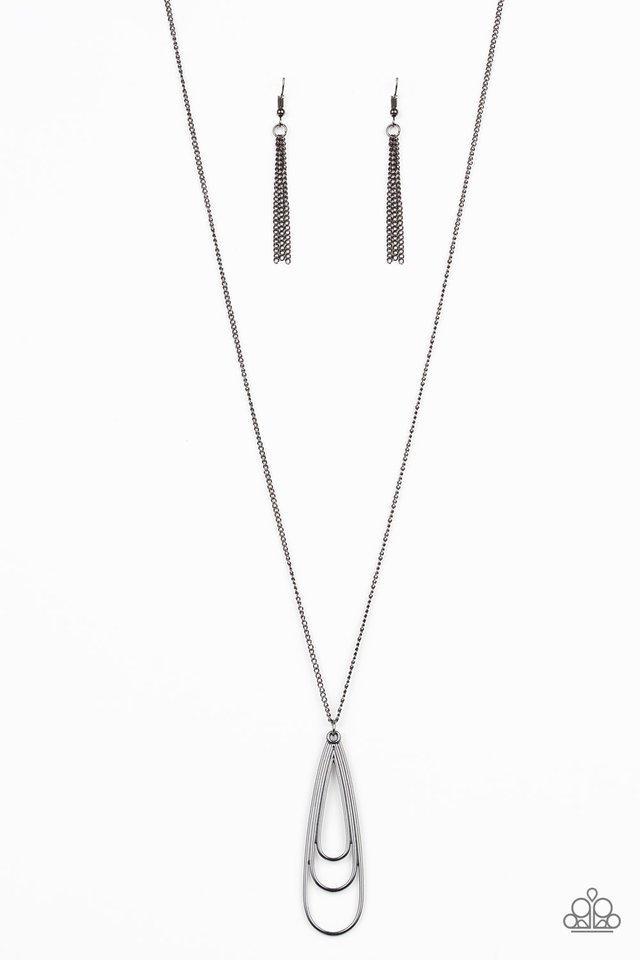 Gradually increasing in size, glistening gunmetal teardrops coalesce into a rippling frame for an edgy look. The airy pendant swings from the bottom of a lengthened gunmetal chain for an edgy look. Features an adjustable clasp closure.
