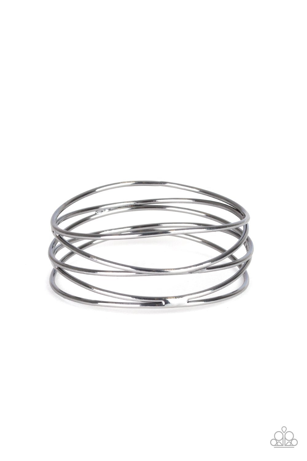 A collection of glistening gunmetal bangles join into an abstractly layered cuff around the wrist for a casual glam.