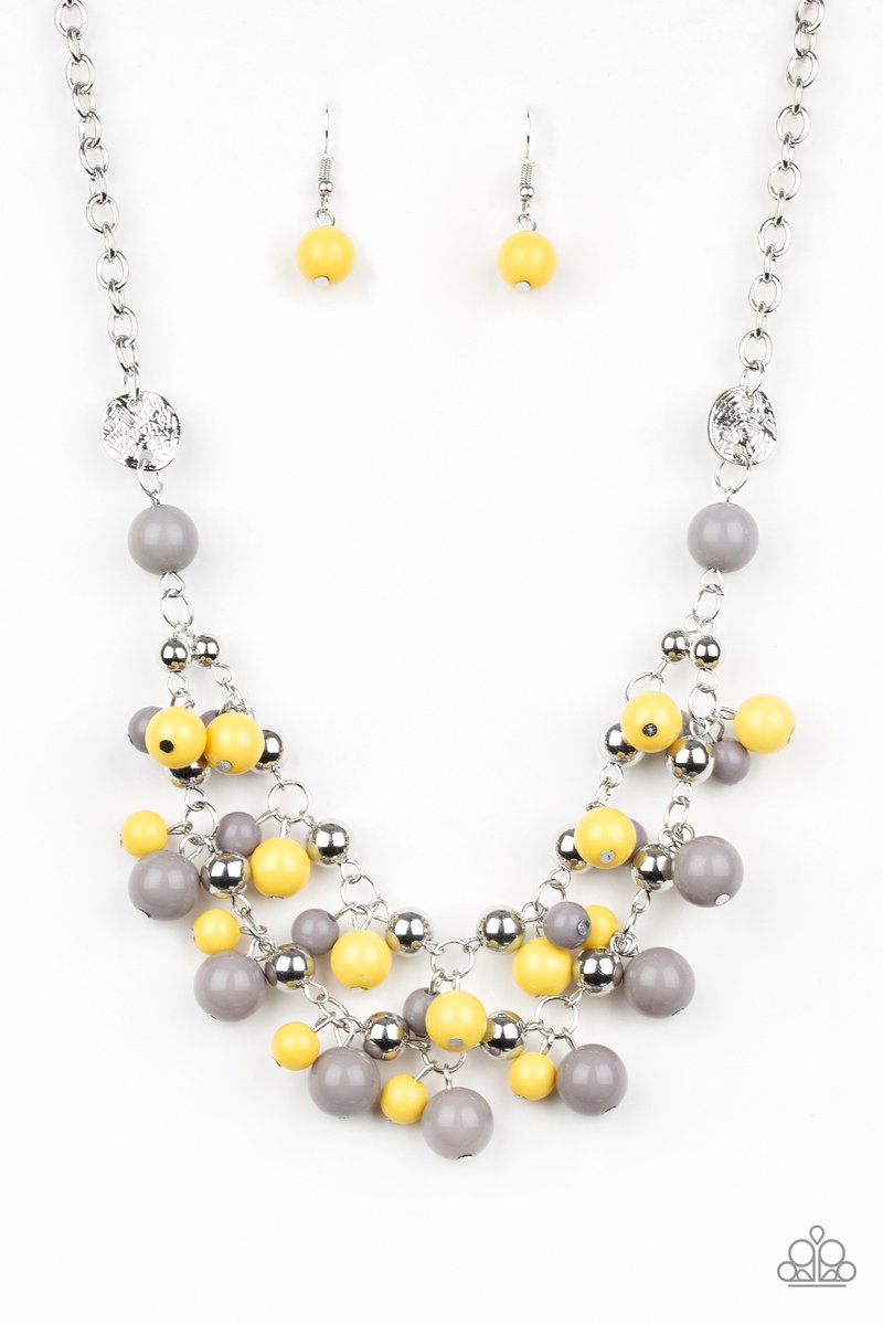Hammered silver discs give way to layers of gray, yellow, and shiny silver beads. The colorful collection layers below the collar, creating a bubbly fringe. Features an adjustable clasp closure.