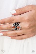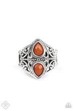 Two back-to-back Cinnamon Stick teardrop beads sit atop a stacked band of silver filigree, creating a whimsical centerpiece atop the finger. Features a stretchy band for a flexible fit.