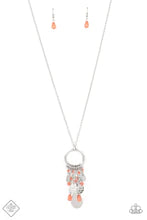 Separated by dainty silver rings, coral and Basil crystal-like beads stream from the bottom of a flat silver hoop. Gradually increasing in size, hammered silver teardrops add texture and shimmer to the design for a boisterous finish. Features an adjustable clasp closure.