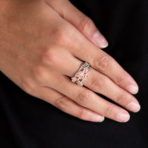 Painted in the refreshing hue of Living Coral, dainty silver butterflies flutter across arcing silver bars for a whimsical fashion. Features a dainty stretchy band for a flexible fit.
